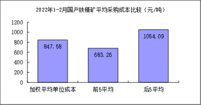 1-2月對標(biāo)企業(yè)國產(chǎn)鐵精礦折算成62%品位的平均采購成本為847.58元/噸,成本最低的前5家企業(yè)的加權(quán)平均采購成本為683.26元/噸,比對標(biāo)企業(yè)平均采購成本低164.32元/噸,低于平均采購成本19.39%;而采購成本最高的5家企業(yè)的加權(quán)平均采購成本為1054.09元/噸,比對標(biāo)企業(yè)平均采購成本高206.50元/噸,高于平均采購成本24.36%。