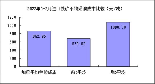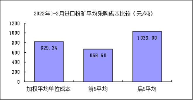 進(jìn)口粉礦2月份加權(quán)平均采購成本859.66元/噸,環(huán)比升高79.56元/噸,升幅為10.20%。1-2月累計平均采購成本為811.65元/噸,同比下降276.62元/噸,降幅為25.42%。