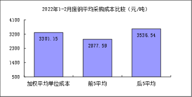 1-2月對標(biāo)企業(yè)廢鋼平均采購成本最低的前5家企業(yè)的加權(quán)平均采購成本為2877.59元/噸,比對標(biāo)企業(yè)平均采購成本低423.55元/噸,低于平均采購成本12.83%;而采購成本最高的5家企業(yè)加權(quán)平均采購成本為3536.54元/噸,比對標(biāo)企業(yè)平均采購成本高235.40元/噸,高于平均采購成本7.13%。