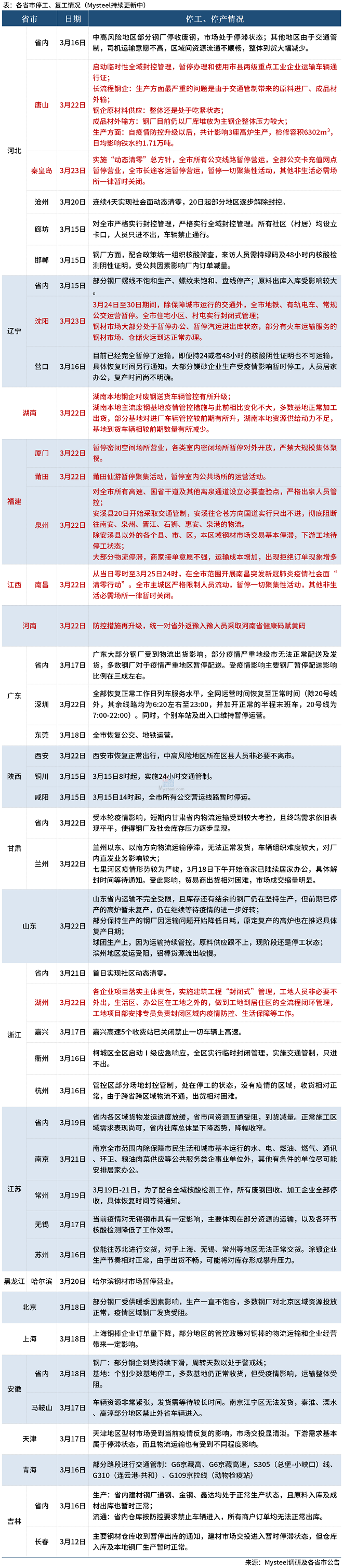 附:各省市地區(qū)鋼廠停工、停產(chǎn)情況: