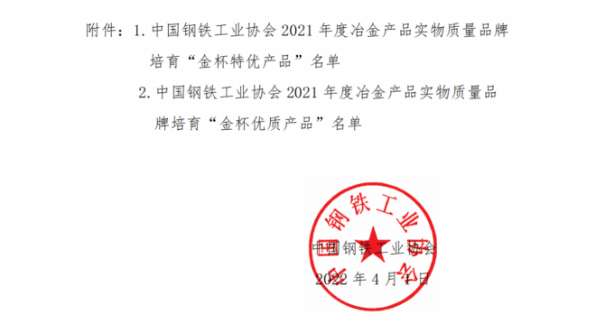 根據中國鋼鐵工業協會《冶金產品實物質量品牌培育管理 辦法》(鋼協〔2019〕38號)的要求,2021年度冶金產品實物質量品牌培育活動經申報、初審、專業認定、公示及異議處理等工作程序,并通過中國鋼鐵工業協會“冶金產品實物質量品牌培育審定委員會”審定,172項產品審定冠名為“金杯優質產品”,10項產品審定冠名為“金杯特優產品”。