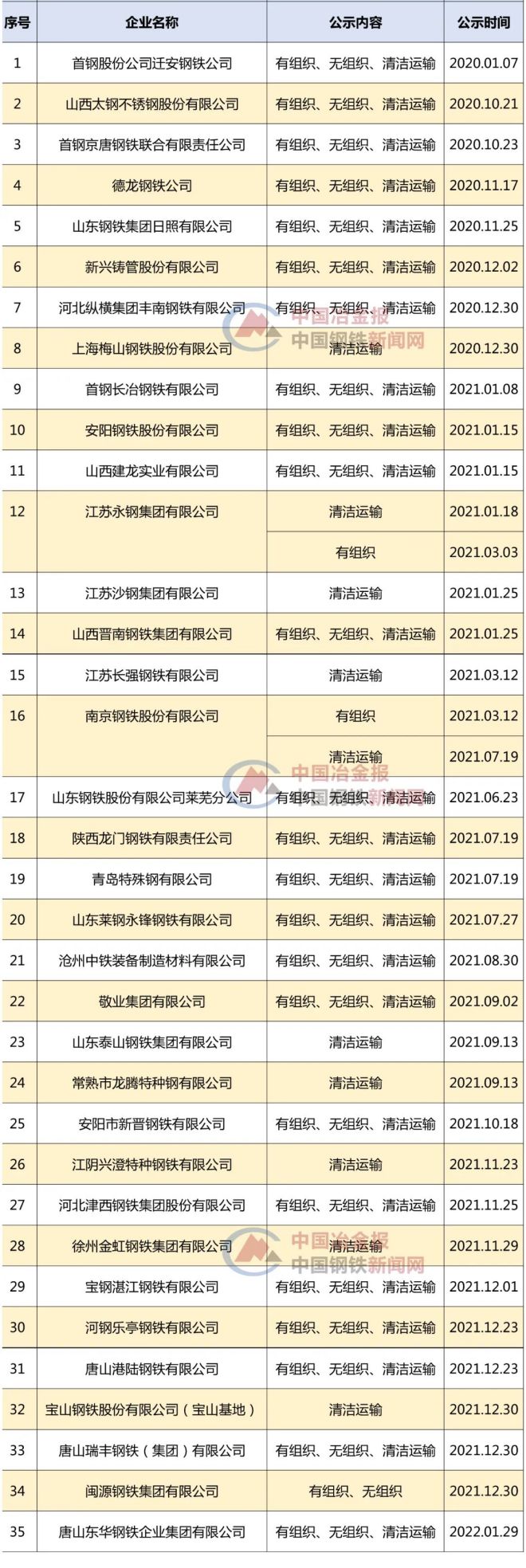 據(jù)中國(guó)鋼鐵工業(yè)協(xié)會(huì)網(wǎng)站顯示,目前已有35家鋼企完成超低排放改造公示,具體情況整理如下——