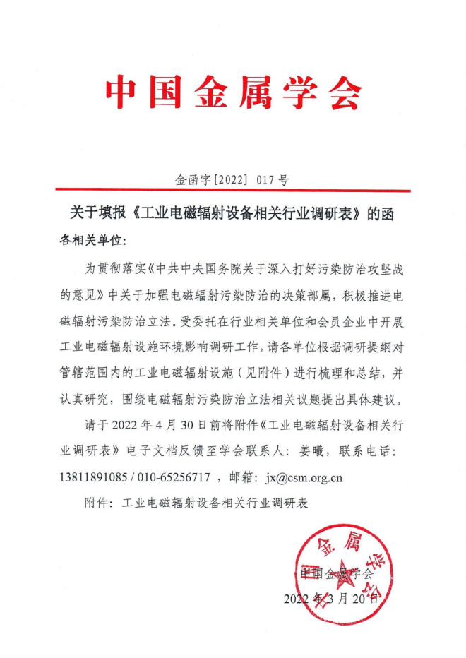 中國金屬學會關于填報《工業電磁輻射設備相關行業調研表》的函