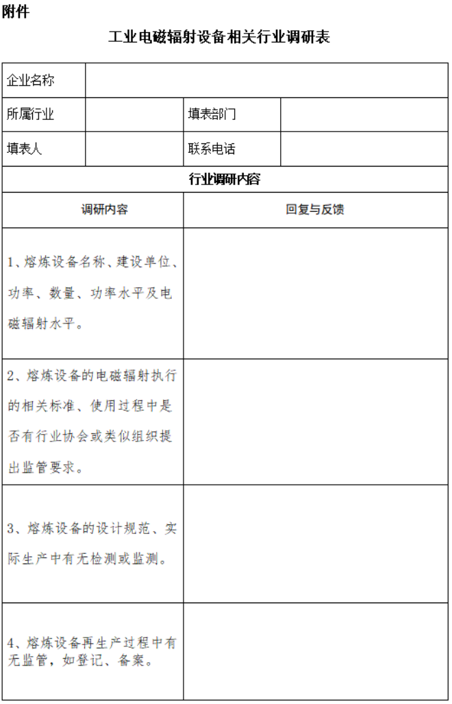 為貫徹落實《中共中央國務院關于深入打好污染防治攻堅戰的意見》中關于加強電磁輻射污染防治的決策部屬,積極推進電磁輻射污染防治立法,中國金屬學會受相關單位委托,在行業相關單位和會員企業中開展工業電磁輻射設施環境影響調研工作,請各單位根據調研提綱對管轄范圍內的工業電磁輻射設施(見附件)進行梳理和總結,并認真研究,圍繞電磁輻射污染防治立法相關議題提出具體建議。