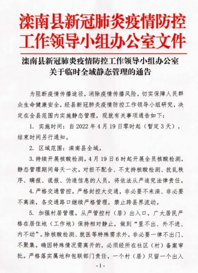 1.封控時間:自2022年4月18日零時起實施臨時全域封控管理,解除時間另行通知。