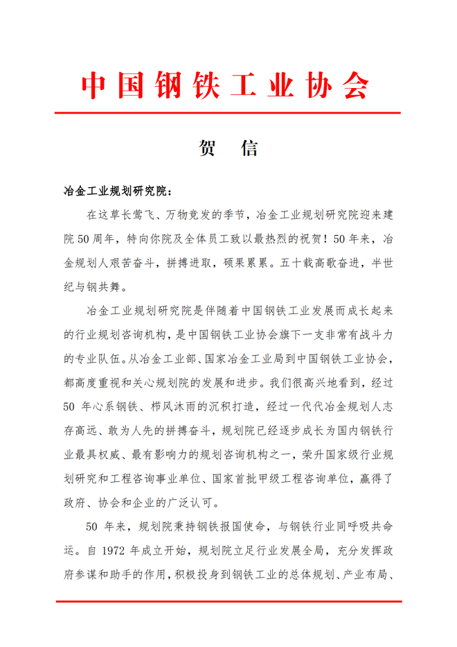 在這草長鶯飛、萬物競發的季節,冶金工業規劃研究院迎來建院50周年,特向你院及全體員工致以最熱烈的祝賀!50年來,冶金規劃人艱苦奮斗,拼搏進取,碩果累累。五十載高歌奮進,半世紀與鋼共舞。