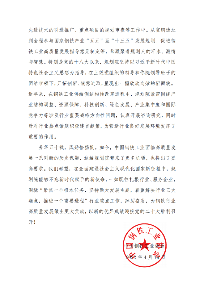 芳華五十載,風勁恰揚帆。如今,中國鋼鐵工業面臨高質量發展一系列新的歷史課題,這給規劃院帶來了更多機遇,也提出了更高要求。我們希望,在全面建設社會主義現代化國家新征程中,規劃院能夠不忘新時代賦予的新使命,一如既往扎根行業、服務企業,圍繞“聚焦一個根本任務,堅持兩大發展主題,著重解決行業三大痛點,推進一個重要進程”行業重點工作,踔厲奮發,為鋼鐵行業高質量發展做出更大貢獻,以新的優異成績迎接黨的二十大勝利召開!