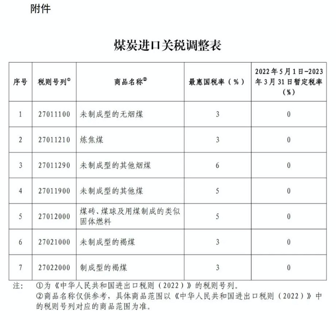 從《公告》中獲悉,為加強能源供應保障,推進高質量發展,國務院關稅稅則委員會按程序決定,自2022年5月1日至2023年3月31日,對煤炭實施稅率為零的進口暫定稅率。