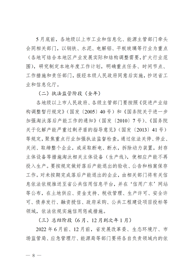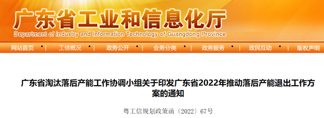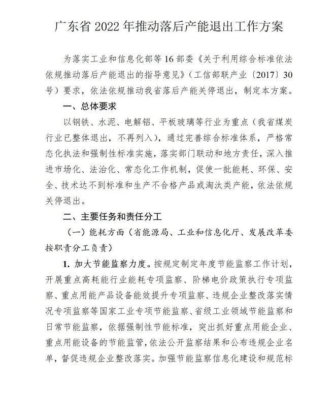 近日,廣東省工信廳網站發布了廣東省淘汰落后產能工作協調小組關于印發廣東省2022年推動落后產能退出工作方案的通知。《廣東省2022年推動落后產能退出工作方案》(以下簡稱《方案》)提出,以鋼鐵、水泥、電解鋁、平板玻璃等行業為重點,通過完善綜合標準體系,嚴格常態化執法和強制性標準實施,落實部門聯動和地方責任,深入推進市場化、法治化、常態化工作機制,促使一批能耗、環保、安全、技術達不到標準和生產不合格產品或淘汰類產能,依法依規關停退出。