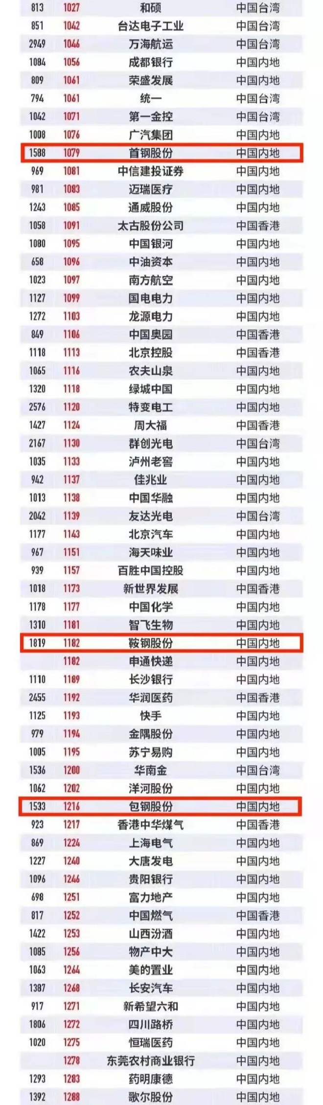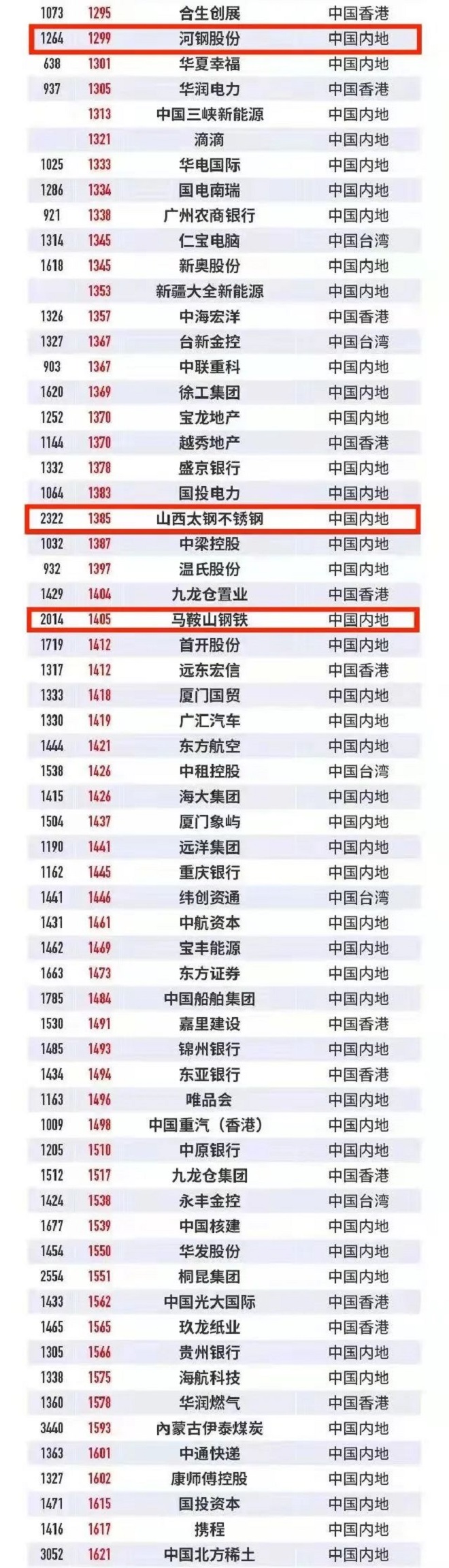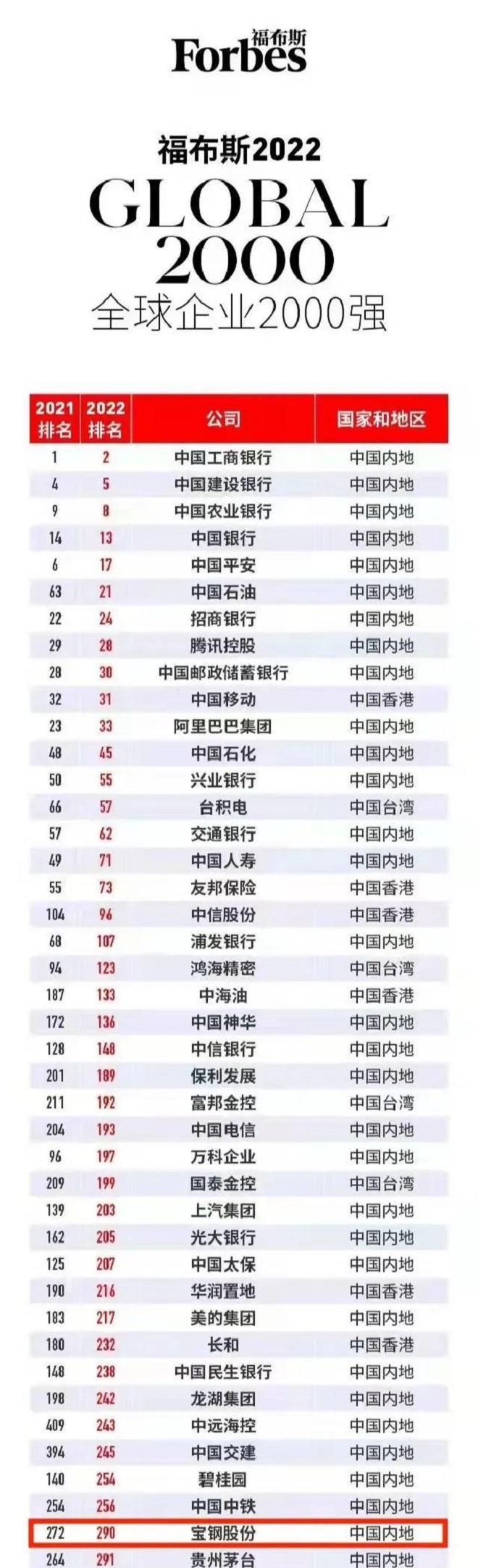 5月12日,福布斯發布2022全球企業2000強,12家中國鋼企上榜,10家鋼企排名大幅上升。具體排名如下:寶鋼股份(第290位),中鋼(中國臺灣,排名第620位),華菱鋼鐵(第1020位),首鋼股份(第1079位),鞍鋼股份(第1182位),包鋼股份(第1216位),河鋼股份(第1299位),山西太鋼不銹鋼(第1385位),馬鞍山鋼鐵(第1405位),新鋼股份(第1632位),南鋼股份(第1895位),山東鋼鐵(第1919位)。其中,山西太鋼不銹鋼上升937位,鞍鋼股份上升637位,馬鞍山鋼鐵上升609位,首鋼股份上升509位,中鋼(中國臺灣)上升478位,包鋼股份上升317位,新鋼股份上升243位,南鋼股份上升97位,山東鋼鐵上升94位,華菱鋼鐵上升58位。此外,冶建類企業中,中國中冶排名第617位。