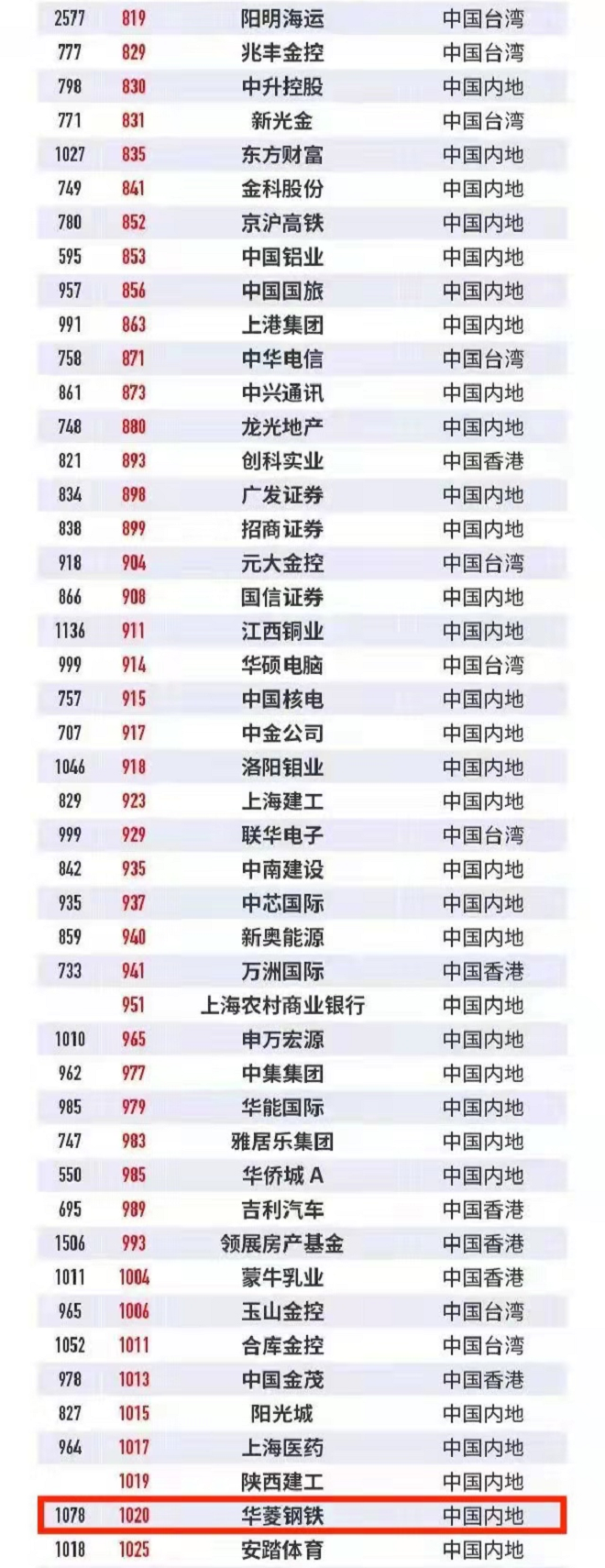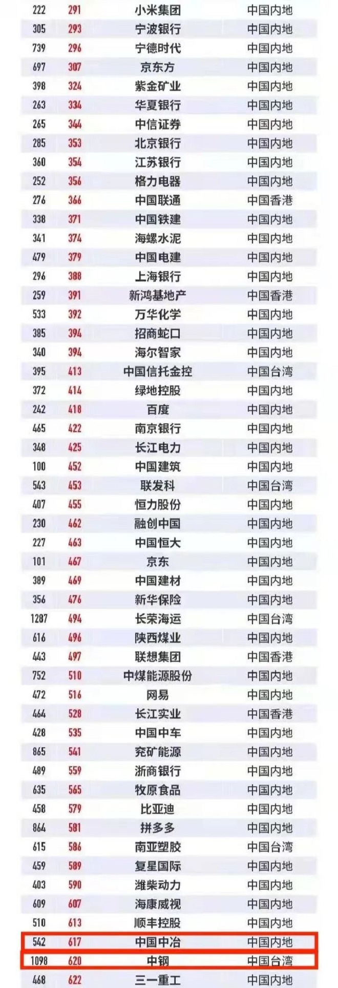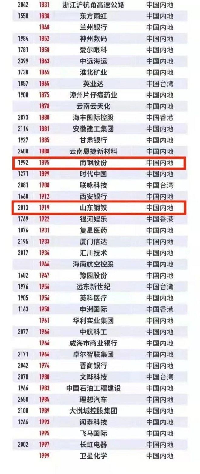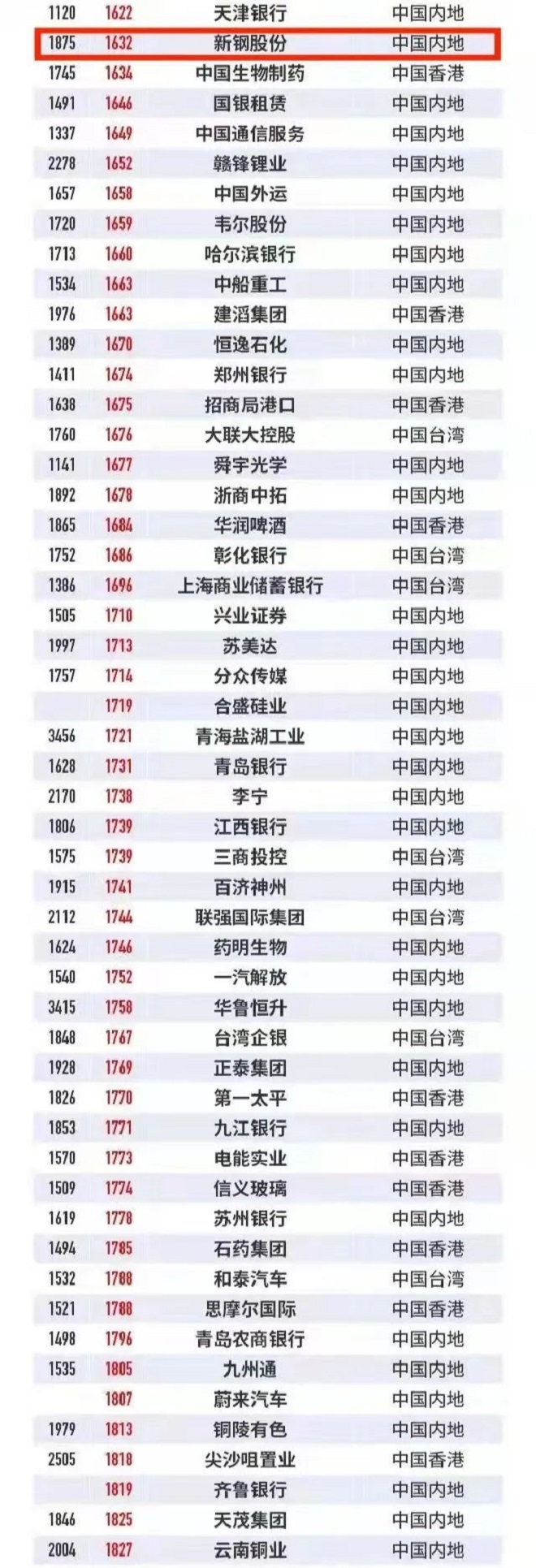 5月12日,福布斯發布2022全球企業2000強,12家中國鋼企上榜,10家鋼企排名大幅上升。具體排名如下:寶鋼股份(第290位),中鋼(中國臺灣,排名第620位),華菱鋼鐵(第1020位),首鋼股份(第1079位),鞍鋼股份(第1182位),包鋼股份(第1216位),河鋼股份(第1299位),山西太鋼不銹鋼(第1385位),馬鞍山鋼鐵(第1405位),新鋼股份(第1632位),南鋼股份(第1895位),山東鋼鐵(第1919位)。其中,山西太鋼不銹鋼上升937位,鞍鋼股份上升637位,馬鞍山鋼鐵上升609位,首鋼股份上升509位,中鋼(中國臺灣)上升478位,包鋼股份上升317位,新鋼股份上升243位,南鋼股份上升97位,山東鋼鐵上升94位,華菱鋼鐵上升58位。此外,冶建類企業中,中國中冶排名第617位。