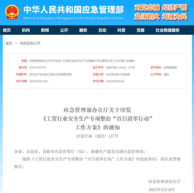 5月20日,中華人民共和國應急管理部網站發布了關于印發《工貿行業安全生產專項整治“百日清零行動”工作方案》的通知(以下簡稱“《通知》”)。