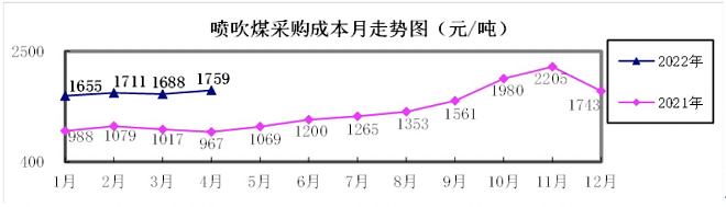 噴吹煤4月份加權(quán)平均折算成干基的采購成本為1759.47元/噸,環(huán)比升高71.86元/噸,升幅為4.26 %。1-4月累計平均折算成干基的采購成本為1692.66元/噸,同比升高678.56元/噸,升幅為66.91%。