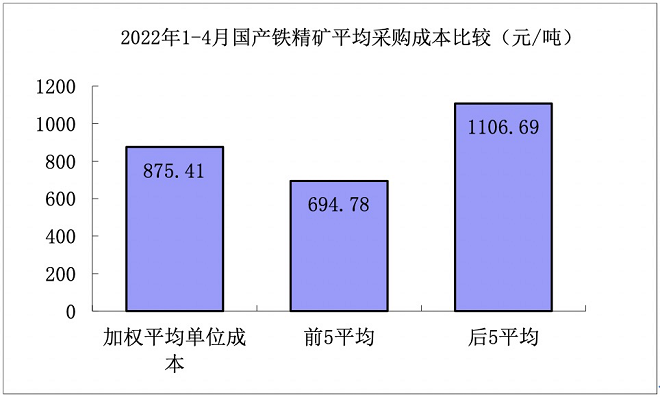 1-4月對標企業(yè)國產(chǎn)鐵精礦折算成62%品位的平均采購成本為875.41元/噸,成本最低的前5家企業(yè)的加權(quán)平均采購成本為694.78元/噸,比對標企業(yè)平均采購成本低180.64元/噸,低于平均采購成本20.63%;而采購成本最高的5家企業(yè)的加權(quán)平均采購成本為1106.69元/噸,比對標企業(yè)平均采購成本高231.27元/噸,高于平均采購成本26.42%。