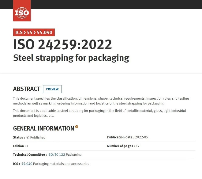 2022年5月23日,由中國牽頭研制的ISO 24259:2022 Steel strapping for packaging《包裝用鋼帶》國際標準正式批準發布。該標準作為我國包裝領域第一個ISO國際標準,填補了我國在該領域的空白,標志著我國在包裝領域的國際標準化工作取得重大突破。