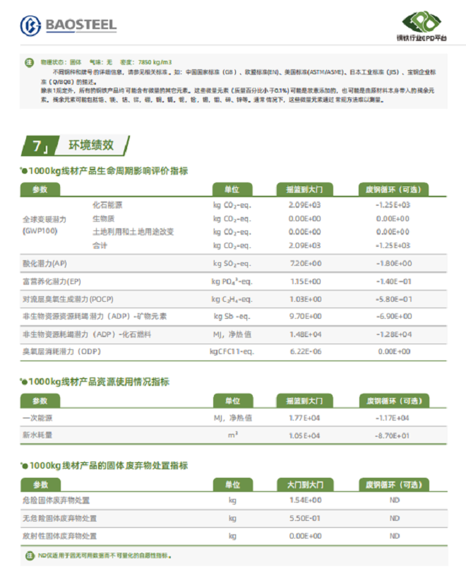 圖為寶鋼股份線(xiàn)材產(chǎn)品EPD中的環(huán)境績(jī)效頁(yè)截圖。