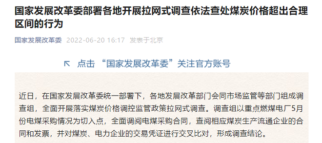6月20日,國家發展改革委官微發表文章稱,國家發展改革委部署各地開展拉網式調查依法查處煤炭價格超出合理區間的行為。調查組以重點燃煤電廠5月份電煤采購情況為切入點,全面調閱電煤采購合同,查閱相應煤炭生產流通企業的合同和發票,并對煤炭、電力企業的交易憑證進行交叉比對,形成調查結論。從反饋的部分調查結果看,已查實一些企業煤炭銷售價格超出合理區間。