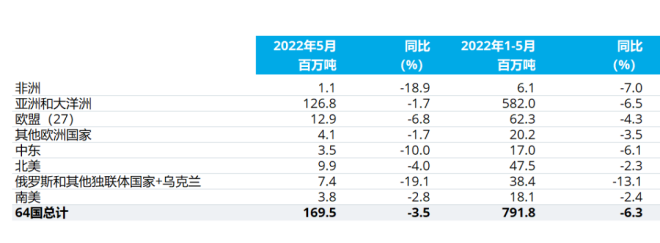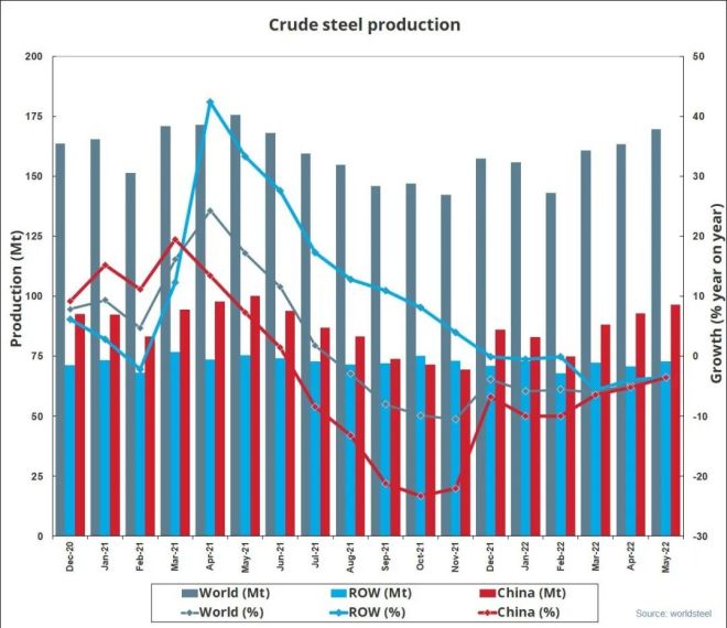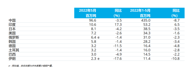 2022年5月全球64個納入世界鋼鐵協會統計國家的粗鋼產量為1.695億噸,同比下降3.5%。