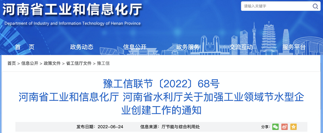 6月24日,河南省工業和信息化廳、河南省水利廳發布了《關于加強工業領域節水型企業創建工作的通知》(以下簡稱《通知》),推進重點用水工業領域節水型企業建設,促進企業對標達標,加快轉變工業用水方式,全面提升工業用水效率和節水技術水平。