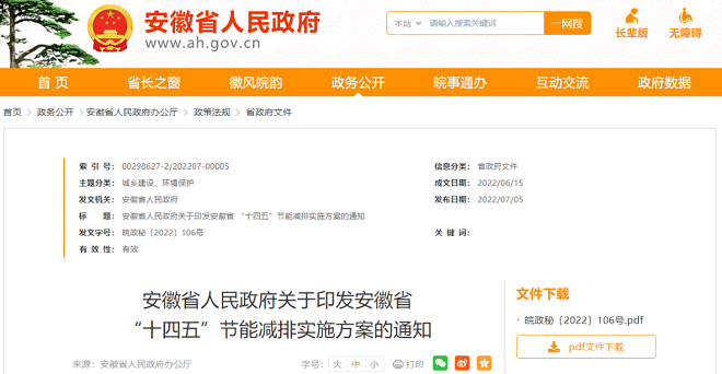 7月6日,安徽省人民政府網站發布了《安徽省人民政府關于印發安徽省“十四五”節能減排實施方案的通知》(以下簡稱《通知》)。
