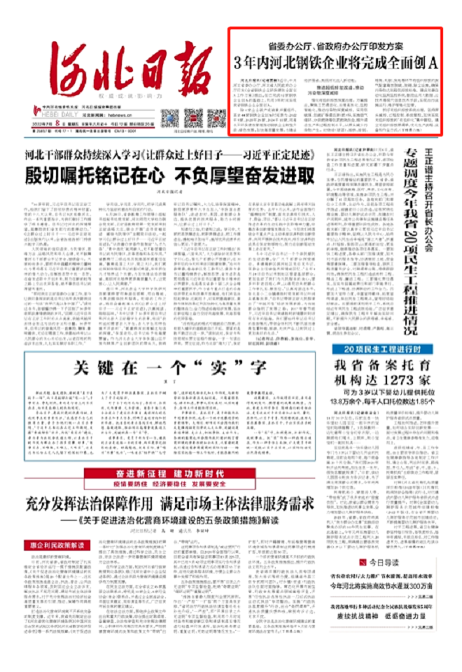7月8日河北日報發布了《3年內河北鋼鐵企業將完成全面創A》一文。從文中獲悉,中共河北省委辦公廳、河北省人民政府辦公廳印發《全省鋼鐵企業環保績效全面創A工作方案》提出,在已完成12家鋼鐵企業創A的基礎上,利用3年時間實現河北省鋼鐵企業全面創A。