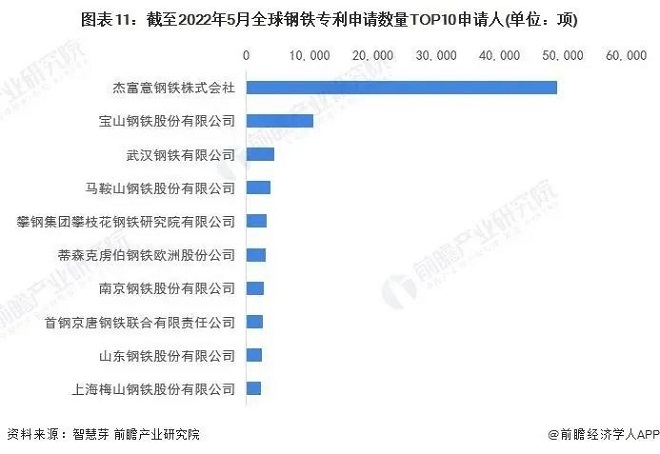 從前瞻前瞻經濟學人獲悉,截至2022年5月20日,全球鋼鐵行業專利申請數量TOP10申請人分別是杰富意(JFE)鋼鐵株式會社、寶山鋼鐵股份有限公司、武漢鋼鐵有限公司、馬鞍山鋼鐵股份有限公司、攀鋼集團攀枝花鋼鐵研究院有限公司、蒂森克虜伯鋼鐵歐洲股份公司、南京鋼鐵股份有限公司、首鋼京唐鋼鐵聯合有限責任公司、山東鋼鐵股份有限公司和上海梅山鋼鐵股份有限公司。