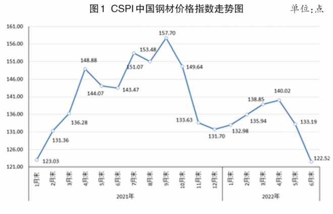 據(jù)中國鋼鐵工業(yè)協(xié)會監(jiān)測,6月末,中國鋼材價格指數(shù)(CSPI)為122.52點,下降10.67點,降幅為8.01%,較5月份擴大3.13個百分點,連續(xù)2個月環(huán)比下降;同比下降20.96點,降幅為14.61%,連續(xù)3個月同比下降(見圖1)。