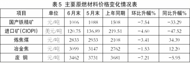 6月末,國產(chǎn)鐵精礦價格環(huán)比下降7.54%,較5月份降幅加大1.74個百分點;CIOPI進口礦價格環(huán)比下降4.60%,較5月份降幅加大0.89個百分點;煉焦煤和冶金焦價格分別環(huán)比下降3.41%和1.53%,降幅分別較5月份減小13.57和17.36個百分點;廢鋼價格環(huán)比下降7.21%,降幅較5月份加大3.35個百分點。值得關(guān)注的是,煤焦價格雖環(huán)比繼續(xù)回落,但環(huán)比降幅明顯收窄,同比仍有較高漲幅(見表5)。