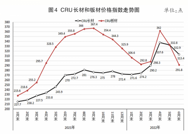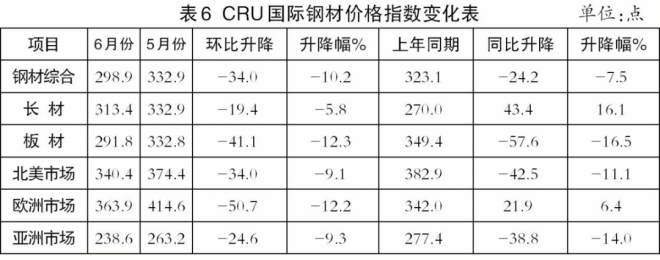 6月份,CRU長材指數(shù)為313.4點,環(huán)比下降19.4點,降幅為5.8%,較5月份加大4.4個百分點;CRU板材指數(shù)為291.8點,環(huán)比下降41.1點,降幅為12.3%,較5月份加大4.3個百分點,比長材降幅大6.5個百分點;CRU長材指數(shù)同比上升43.4點,升幅為16.1%;CRU板材指數(shù)同比下降57.6點,降幅為16.5%(見圖4、表6)。