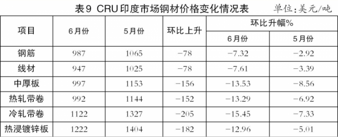 6月份,CRU亞洲鋼材價格指數(shù)為238.6點,環(huán)比下降24.6點,降幅為9.3%;日本制造業(yè)PMI為52.7%,環(huán)比下降0.6個百分點;韓國制造業(yè)PMI為51.3%,環(huán)比下降0.5個百分點;印度制造業(yè)PMI為53.9%,環(huán)比下降0.7個百分點;中國制造業(yè)PMI為50.2%,環(huán)比上升0.6個百分點。6月份,印度市場主要鋼材品種價格均繼續(xù)下降,且環(huán)比降幅均有所加大(見表9)。