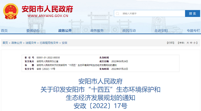 7月22日,安陽市人民政府網站發布了《安陽市“十四五”生態環境保護和生態經濟發展規劃》(以下簡稱“《規劃》”)。
