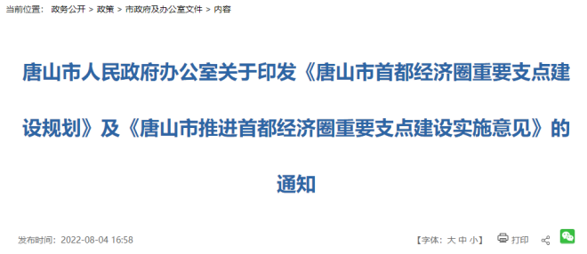 8月4日,唐山市人民政府網(wǎng)站發(fā)布了唐山市人民政府辦公室關(guān)于印發(fā)了《唐山市首都經(jīng)濟(jì)圈重要支點建設(shè)規(guī)劃》(以下簡稱《規(guī)劃》)及《唐山市推進(jìn)首都經(jīng)濟(jì)圈重要支點建設(shè)實施意見》(以下簡稱《意見》)的通知。