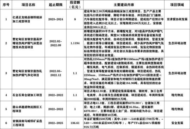 此外,從《通知》中獲悉,首都經(jīng)濟(jì)圈重要支點建設(shè)“十四五”重點項目清單也予以公布,其中涉及到京津冀協(xié)同發(fā)展、新型城鎮(zhèn)化、社會治理、安全發(fā)展、文旅體育、基礎(chǔ)設(shè)施、民生、現(xiàn)代物流、生態(tài)環(huán)境治理等9個項目領(lǐng)域的130個重點項目。其中涉及到鋼鐵行業(yè)相關(guān)的6個,詳情如下: