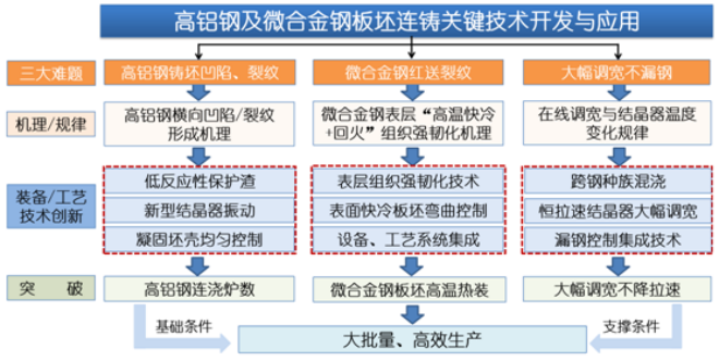 隨著國民經濟發展和產業結構升級,高鋁鋼及微合金鋼等高端鋼鐵材料廣泛應用于汽車、能源電力、海洋工程、船舶等重點領域,高效連鑄生產的技術質量問題日益凸顯。如汽車用DP、TRIP鋼因鋼中Al含量高達1.0%以上,不僅難以實現多爐連澆,而且連鑄板坯存在橫向凹陷、裂紋、斷坯等問題;高等級橋梁鋼、高強鋼、能源鋼、管線鋼等因添加Nb、V、Ti等微合金元素,熱裝鑄坯軋后鋼板表面容易出現裂紋。這些難題不僅影響生產效率,還會造成資源和能源浪費。此外,隨著用戶的個性化需求增多,微合金鋼品種、規格、連鑄短澆次增多,微合金鋼連鑄漏鋼風險增大,直接影響高效連鑄過程的穩定性。相對于普通鋼材,高鋁鋼和微合金鋼元素多且含量高,質量控制難度大、工藝復雜。原有的高效穩定工藝技術,已無法適應高鋁鋼和微合金鋼生產需求,具體體現在: