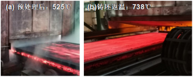 圖2 鑄坯表面溫度與形貌:(a)預處理后;(b)鑄坯返溫后
