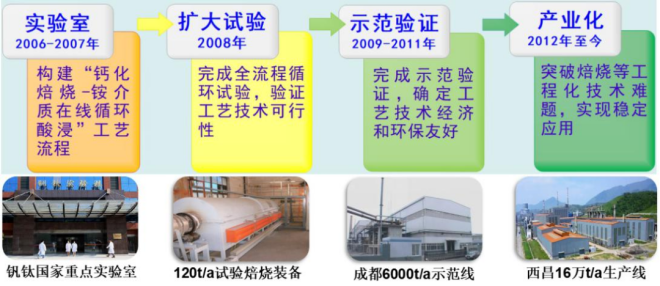 2006年,鞍鋼集團攀鋼研究院先后與重慶大學、武漢科技大學等聯手,以國家“十一五”科技支撐計劃為依托,針對傳統鈉鹽提釩工藝和石灰提釩工藝存在的問題,基于源頭減排的頂層設計思路,通過理論分析和大量實驗室試驗以及年處理120噸標準釩渣全流程擴大試驗,構建了“釩渣鈣化焙燒—銨介質在線循環”提釩新工藝;以6000噸釩渣/a清潔提釩示范線為平臺,完成了工業規模的全流程試驗驗證和技術經濟評估,確定了工藝技術的可行性。在此基礎上,設計新建了年處理16萬噸釩渣的攀鋼西昌釩制品公司,攻克了焙燒黏結和浸出裝備研發等工程化技術難題,成功實現新工藝產業化轉化;同時,從末端治理和高值資源回收的角度,實現了廢棄物中錳、鐵、釩資源有效利用,最終形成了釩資源綠色高效利用系列關鍵技術。