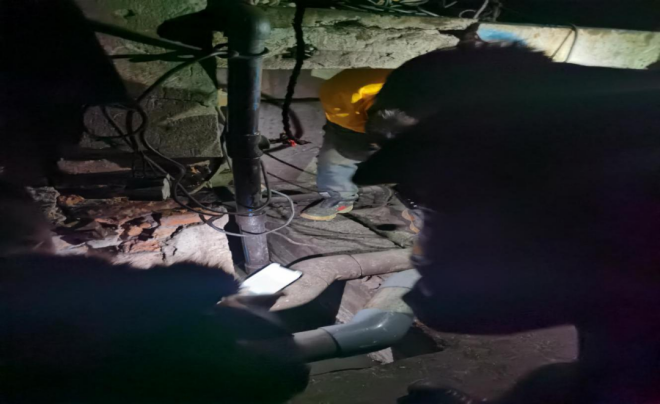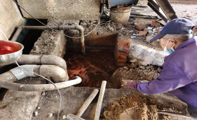 現(xiàn)場(chǎng)檢查時(shí),該公司甘寶素生產(chǎn)車間正在調(diào)試,有4名工人正在對(duì)污水收集池進(jìn)行防腐作業(yè)。污水處理車間內(nèi)有2名工人正在安裝污水處理設(shè)備,新安裝的氨氮吹脫塔與兩個(gè)污水收集罐(舊反應(yīng)釜)相連接,罐內(nèi)裝有甘寶素工序產(chǎn)生的生產(chǎn)廢水。兩個(gè)污水收集罐下方的控制閥門均連接有排水軟管,兩根排水軟管伸向地面上一個(gè)直徑約25厘米的孔洞,孔洞內(nèi)有鐵制管道通向地下井。經(jīng)現(xiàn)場(chǎng)測(cè)量,孔洞下的管道深約10米,周邊地面上有明顯的排水痕跡。經(jīng)對(duì)污水收集罐和地下井內(nèi)的存水進(jìn)行同源性監(jiān)測(cè),確認(rèn)地下井內(nèi)有生產(chǎn)廢水。