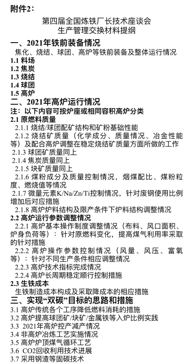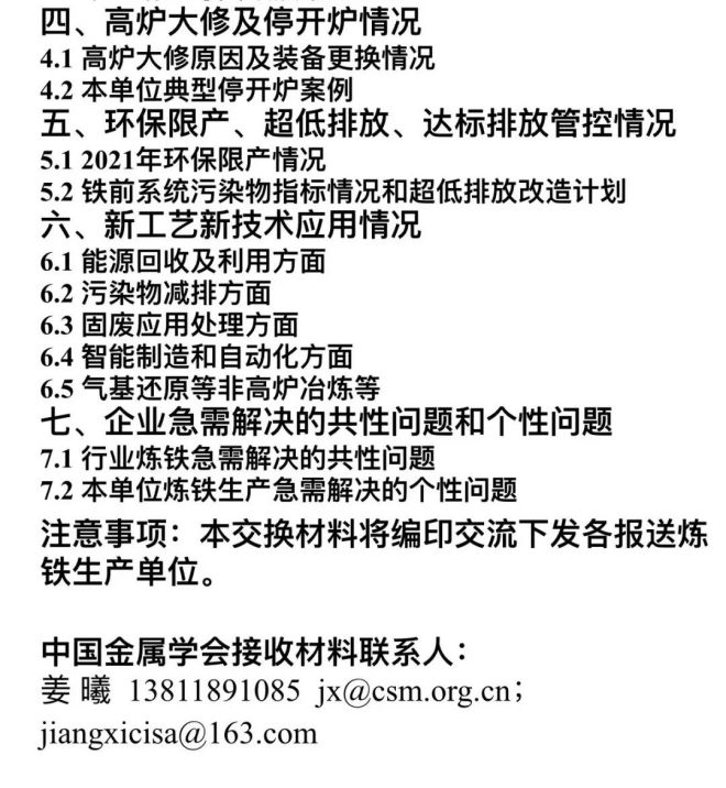 2. 2021年各企業煉鐵生產技術總結交換材料Word版本。各單位需提供本企業交換材料,會議期間交流下發各生產單位。接收材料聯系人: 姜 曦 13811891085 jx@csm.org.cn; jiangxicisa@163.com