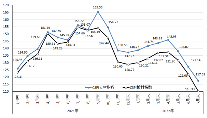 7月末,CSPI長材指數為117.63點,環比下降9.51點,降幅為7.48%;CSPI板材指數為110.33點,環比下降11.73點,降幅為9.61%,高于長材2.13個百分點;與上年同期相比,長材、板材指數分別下降38.59點和44.33點,降幅分別為24.70%和28.66%。(見下圖、表)