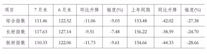據鋼協監測,7月末,中國鋼材價格指數(CSPI)為111.46點,環比下降11.06點,降幅為9.03%,連續第三個月環比下降;同比下降42.02點,降幅為27.38%,連續第四個月同比下降。(見下圖)