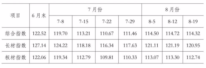7月份,CSPI綜合指數呈波動下降走勢,第一至三周小幅下降;第四周小幅反彈;進入8月份以來,前兩周鋼材價格持續回升,第三周小幅回落。(見下表)