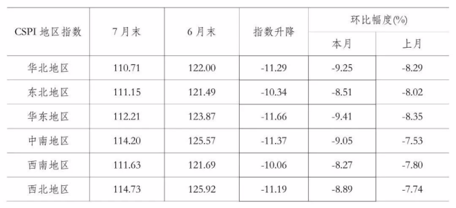 7月份,CSPI全國六大地區鋼材價格指數均持續下降。其中華北、東北、華東、中南、西南和西北地區鋼價指數環比分別下降9.25%、8.51%、9.41%、9.05%、8.27%和8.89%。(見下表)