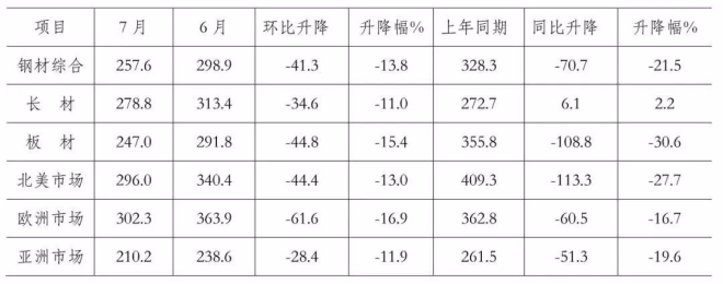7月份,CRU國際鋼材價格指數為257.6點,環比下降41.3點,降幅為13.8%,較上月降幅加大3.6個百分點;同比下降70.7點,降幅為21.5%。(見下圖)