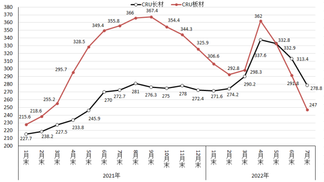 7月份,CRU長材指數為278.8點,環比下降34.6點,降幅為11.0%,較上月加大5.2個百分點;CRU板材指數為247.0點,環比下降44.8點,降幅為15.4%,較上月加大3.0個百分點,比長材降幅高4.3個百分點;與去年同期相比,CRU長材指數同比上升6.1點,升幅為2.2%;CRU板材指數同比下降108.8點,降幅為30.6%。(見下圖)