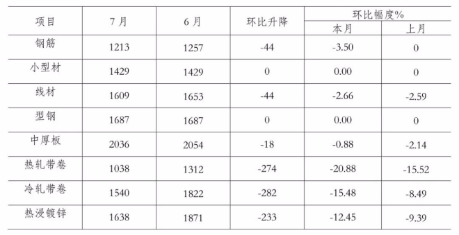 由于國內市場鋼材需求增長不及預期,疊加鐵礦石、煤焦等原燃料價格回落,對鋼價的支撐作用也有所減弱,7月份鋼材價格繼續呈下行走勢。
