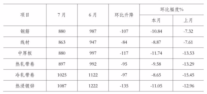 7月末,鋼協監測的八大鋼材品種價格均持續下降,且降幅均較上月有所加大。其中,高線、三級鋼筋、角鋼、中厚板、熱軋卷板、冷軋薄板、鍍鋅板和熱軋無縫管價格環比分別下降263元/噸、281元/噸、496元/噸、496元/噸、503元/噸、530元/噸、518元/噸和480元/噸。(見下表)