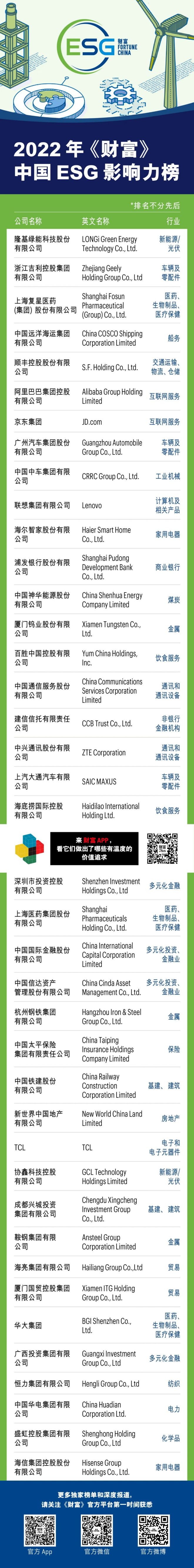 從千年發(fā)展目標(biāo)(MDGs)到可持續(xù)發(fā)展目標(biāo)(SDGs),在聯(lián)合國(guó)的推動(dòng)下,ESG的環(huán)境、社會(huì)和公司治理三大核心指標(biāo)已成為企業(yè)推動(dòng)可持續(xù)發(fā)展的重要標(biāo)準(zhǔn)。此次,中國(guó)ESG 50遵循聯(lián)合國(guó)ESG框架和原則,從2022福布斯全球企業(yè)2000強(qiáng)(依據(jù)全球上市公司當(dāng)年的營(yíng)收、利潤(rùn)、資產(chǎn)和市值四個(gè)方面指標(biāo)來排名)中選取了在ESG層面先行一步的50家中國(guó)企業(yè)。