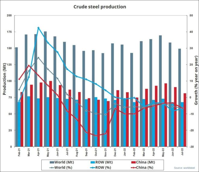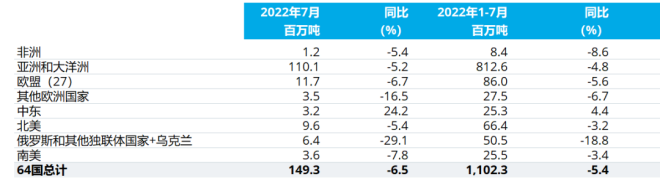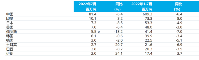 2022年7月全球64個納入世界鋼鐵協會統計國家和地區的粗鋼產量為1.493億噸,同比下降6.5%。