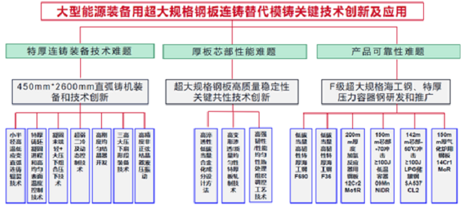 3、用直弧形連鑄代替模鑄或電渣錠生產超大規格海工、容器鋼板的產品研發和推廣應用尚無先例。項目開展前,海工裝備、壓力容器等領域的超大規格能源用鋼板均采用模鑄或電渣錠生產,用直弧形特厚連鑄坯生產保證心部韌性的超大規格能源用鋼板的產品研發仍處于空白狀態,需要從成分設計、關鍵生產工藝技術、用戶應用技術以及產業化推廣應用等方面進行全流程研發。