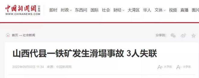 9月2日23時35分,山西省忻州市代縣精誠礦業(yè)有限責任公司發(fā)生滑塌事故,3名人員失聯(lián)。據(jù)中國新聞網(wǎng)報道,記者3日晚間從山西省忻州市代縣融媒體中心獲悉,目前物探工作結束,鉆探設備已到位,3個固定監(jiān)測點正在開展工作,整體救援工作有序推進。